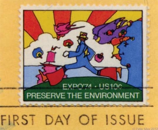 The United States Postal Service commissioned Max to create the 10-cent postage stamp to commemorate the Expo ’74 World’s Fair in Spokane, Washington, and Max drew a colorful psychedelic scene with a “Cosmic Jumper” and a “Smiling Sage” against a backdrop of a cloud, sun rays and a ship at sea on the theme of “Preserve the Environment.”[